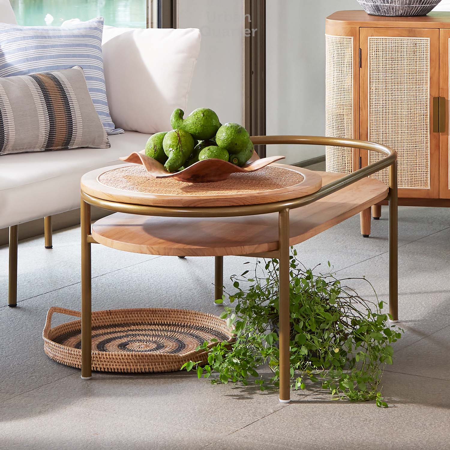 2. Solid kiln-dried teak wood frame in natural finish and natural woven rattan inserts. Gold metal.