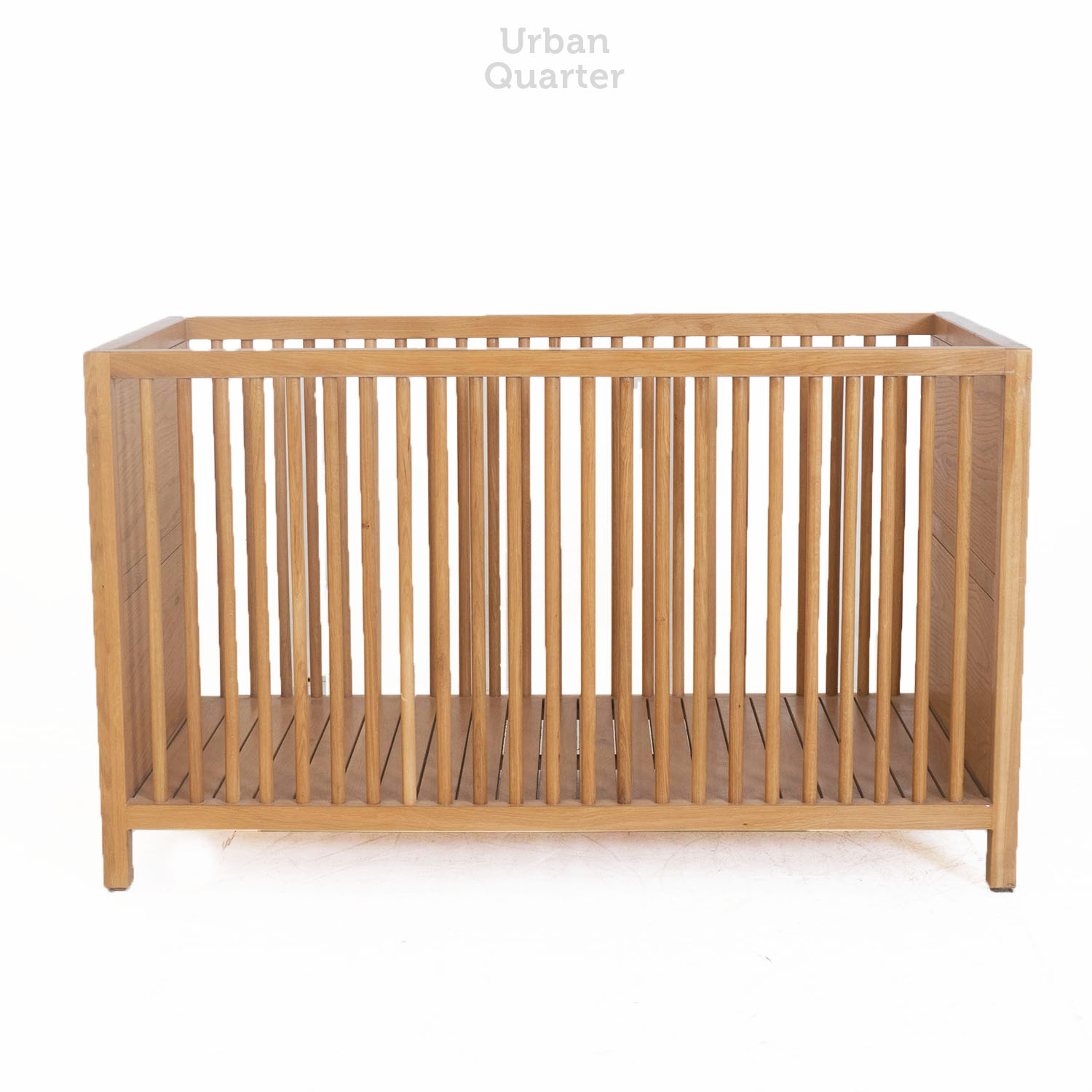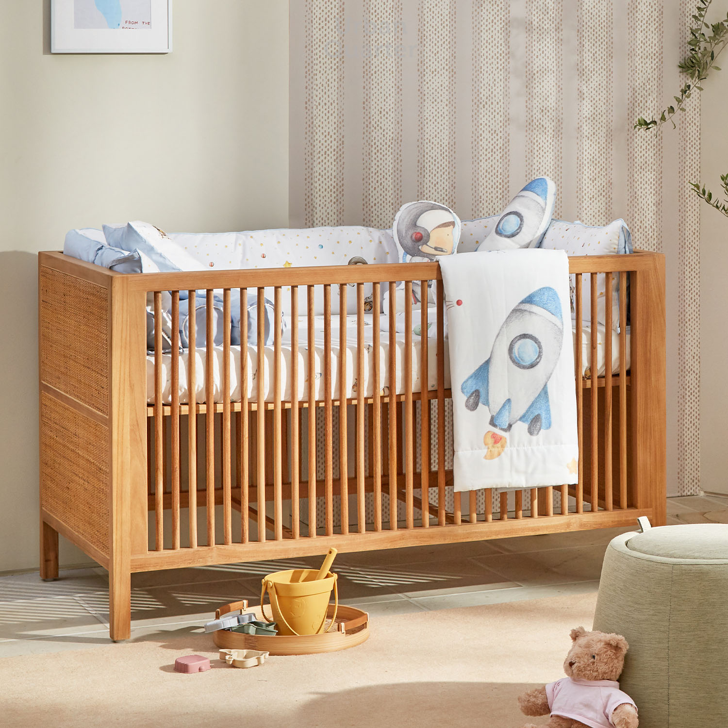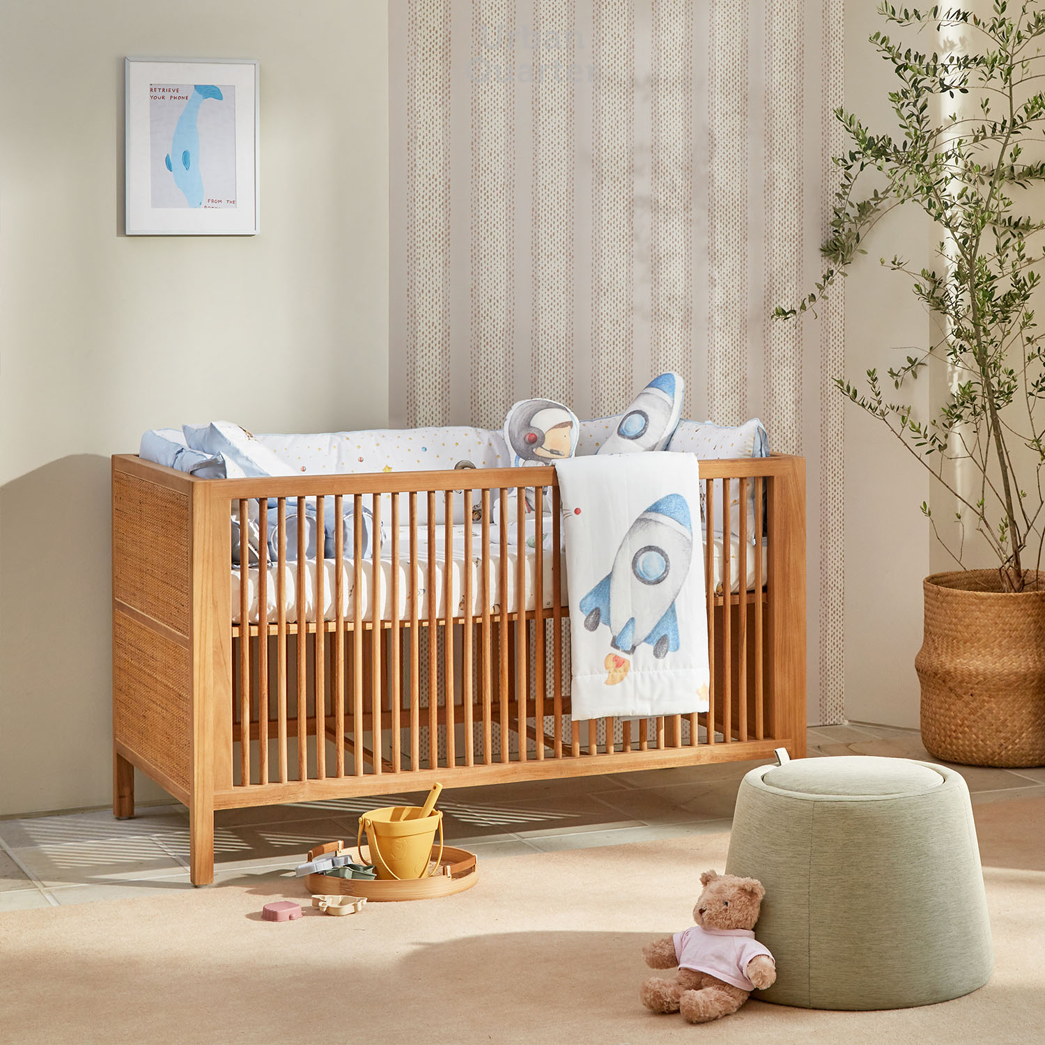 Our Daisy collection furnishes your kid’s nursery or bedroom with a unique mix of natural, sturdy teak wood and rattan webbing. The Daisy Baby Crib is a statement maker for the nursery based on its elevated design and unexpected mix of materials. Durable and featuring a beautiful silhouette, this crib is guaranteed to last for your baby to the next.