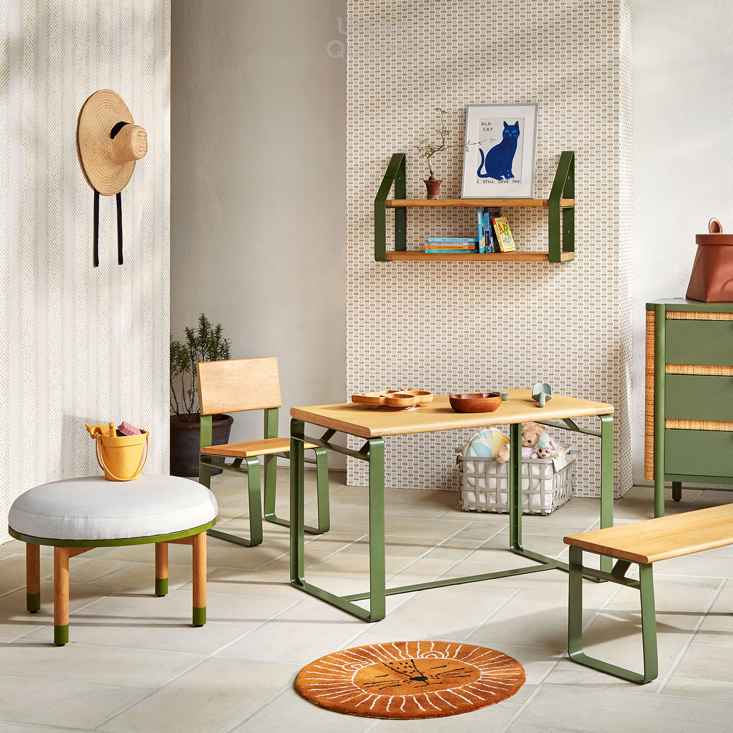 Cute, cool and minimalistic. The Darcy collection features two-tone look featuring a warm wood finish mixed with a cool olive green metal as its base. This versatile wall shelf is great for decorating the kids room or for storing books to toys.