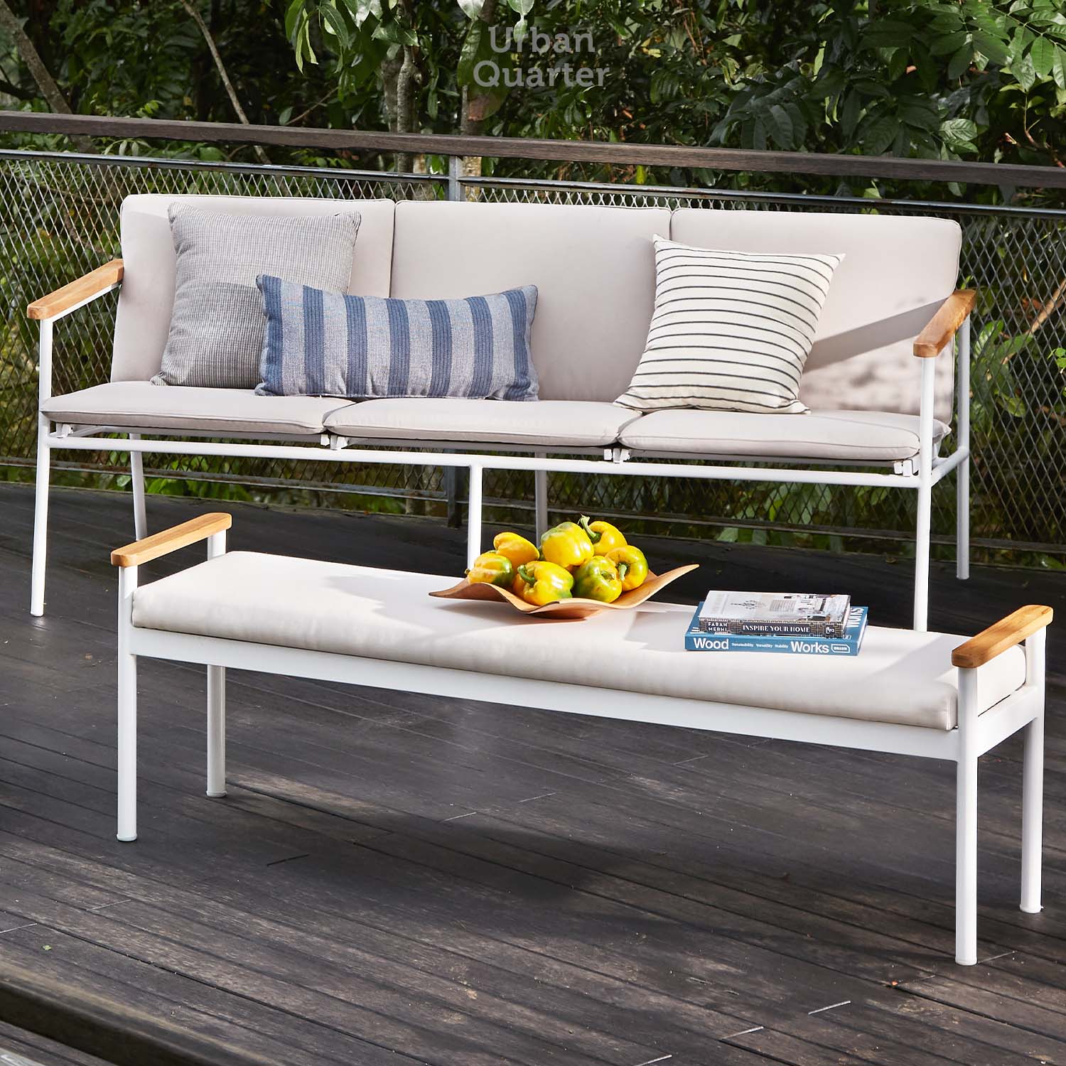 Clean horizontal lines, Fitz is a premium outdoor lounge furniture characterised by a crisp aesthetic look giving it relaxed sociability. Sophisticated in its white finish and solid teak wood detailing, this collection is suitable for the home and commercial outdoor settings. This collection mixes rope, aluminum, and wood for its sleek, modern and minimalistic look.