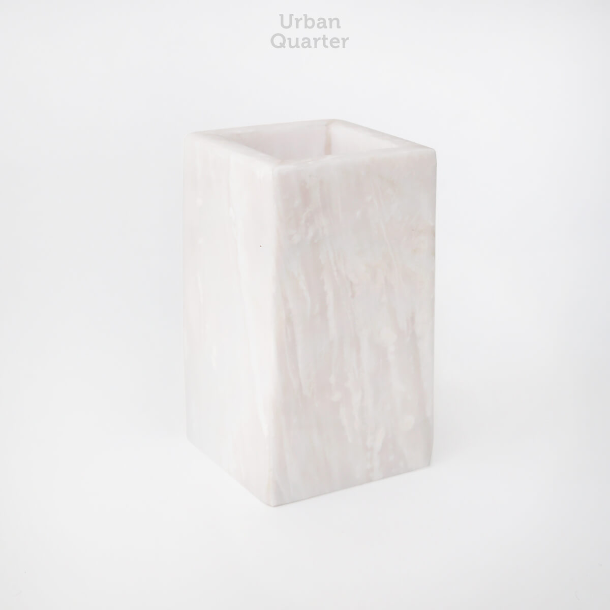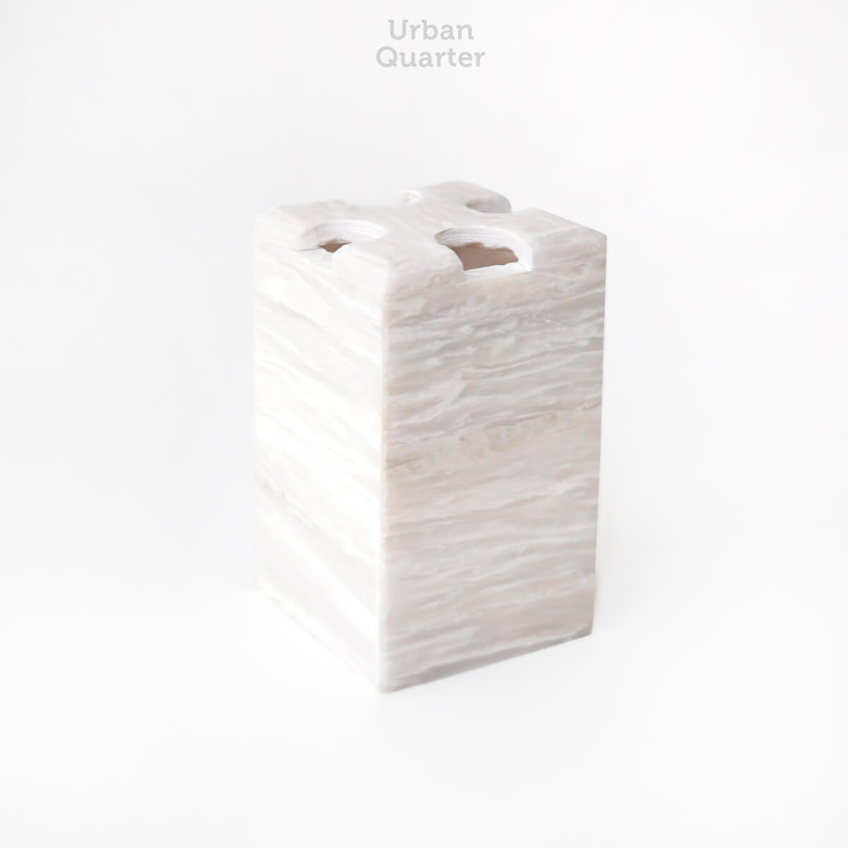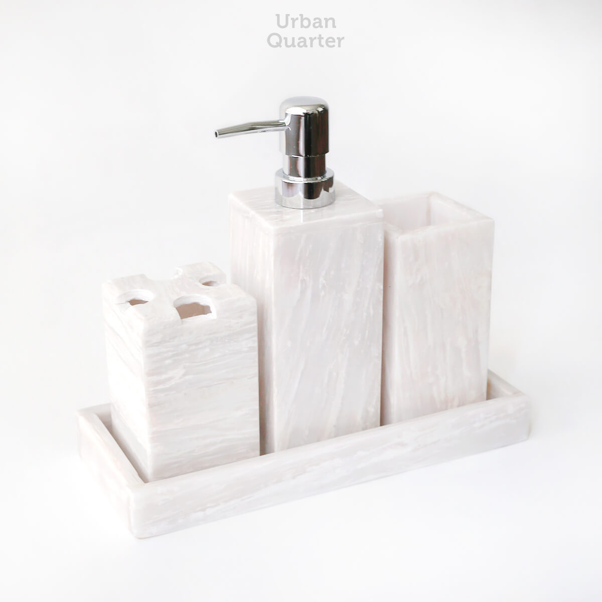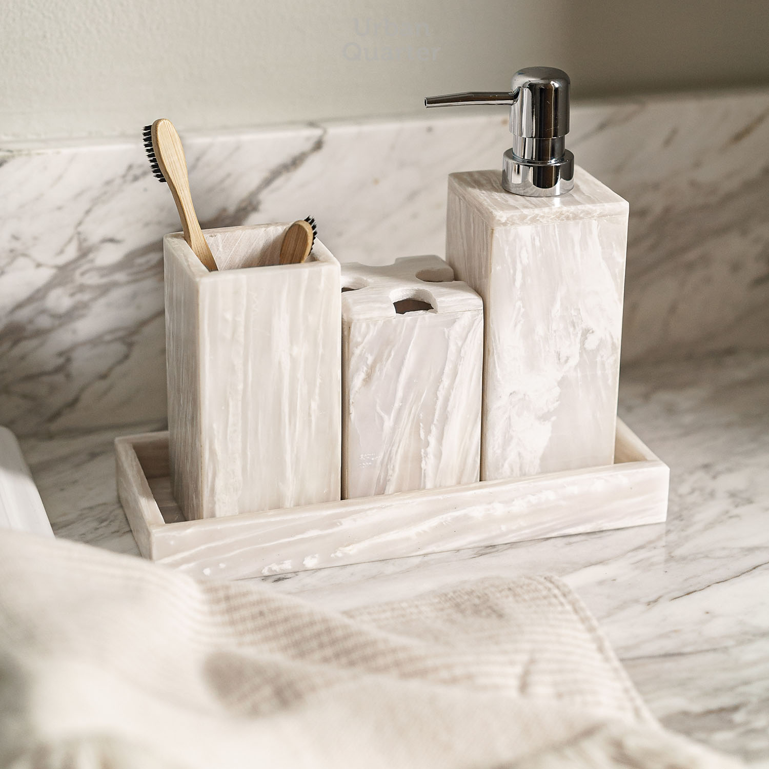 Bring elegant and modern organization to your bathroom with this complete bathroom set. This set includes a marble tray, soap pump, tumbler and toothbrush holder that can fit up to 4 toothbrush.