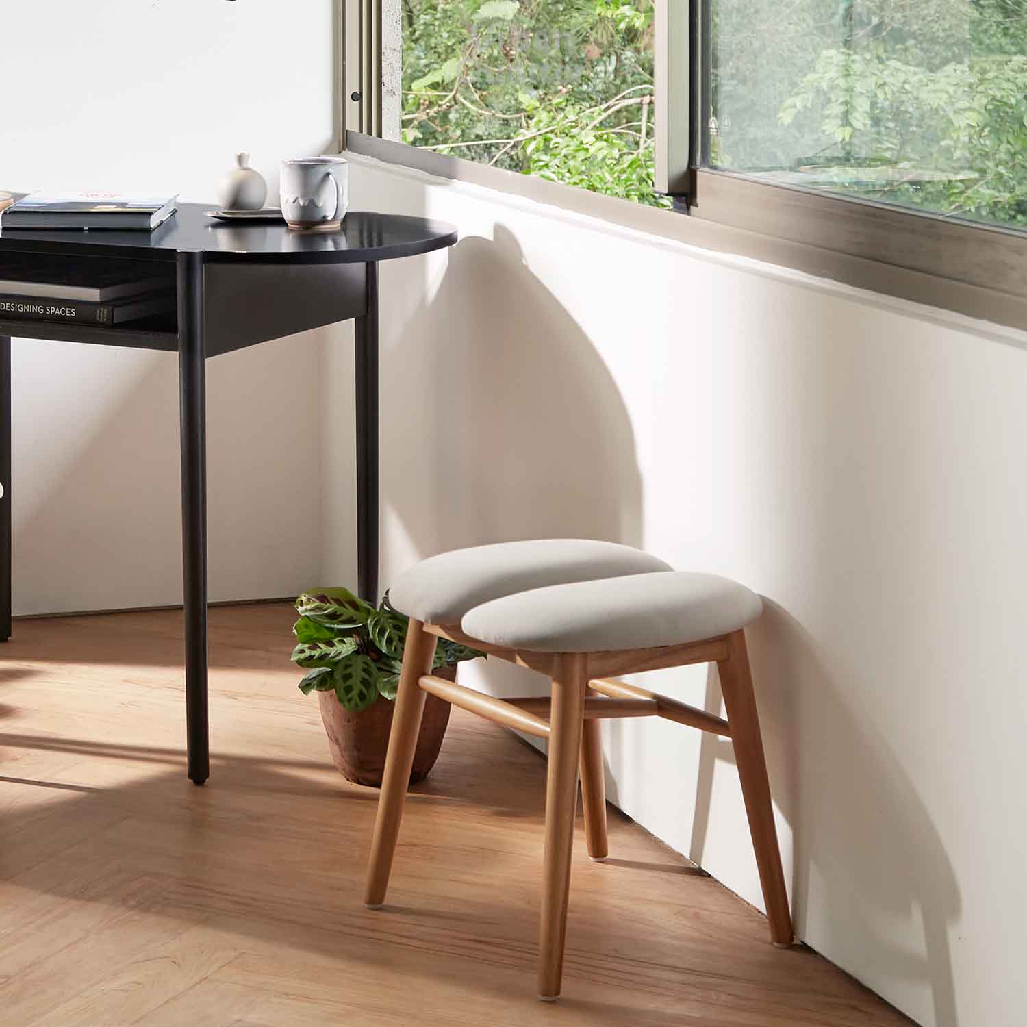 Eclectic but make it modern, the Gowan stools highlight curved upholstery and sleek natural wood. Available in 2 sizes: in low stool and bar stool. This collection is aimed to provide modern additional seating for use in the kitchen or anywhere at home.