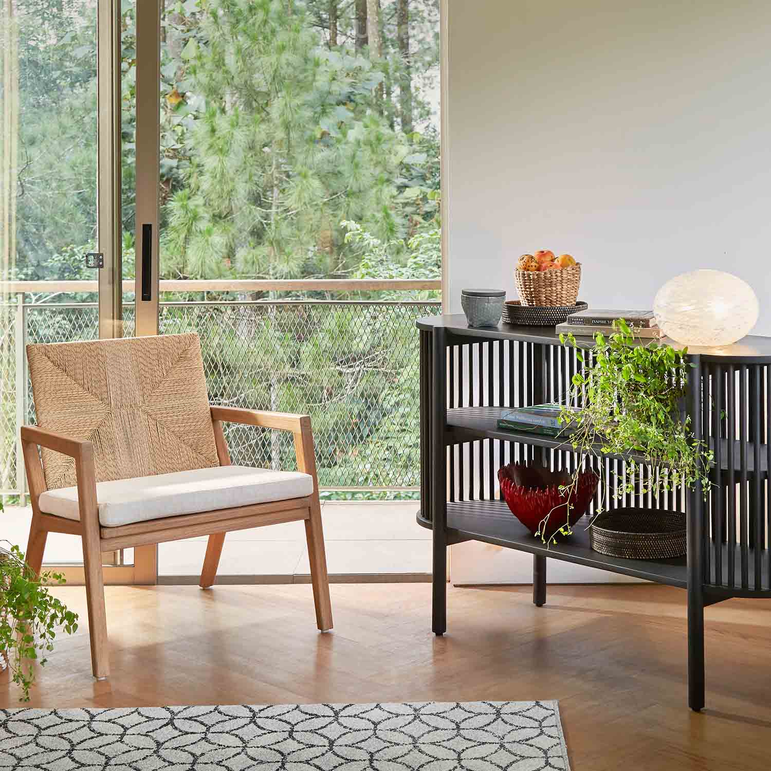 The Jenna armchair mixes materials to elegant effect using wicker and solid kiln-dried teak wood. A seamless juxtaposition of textures and styles, perfect for the living room, entryway to the bedroom or even the office.