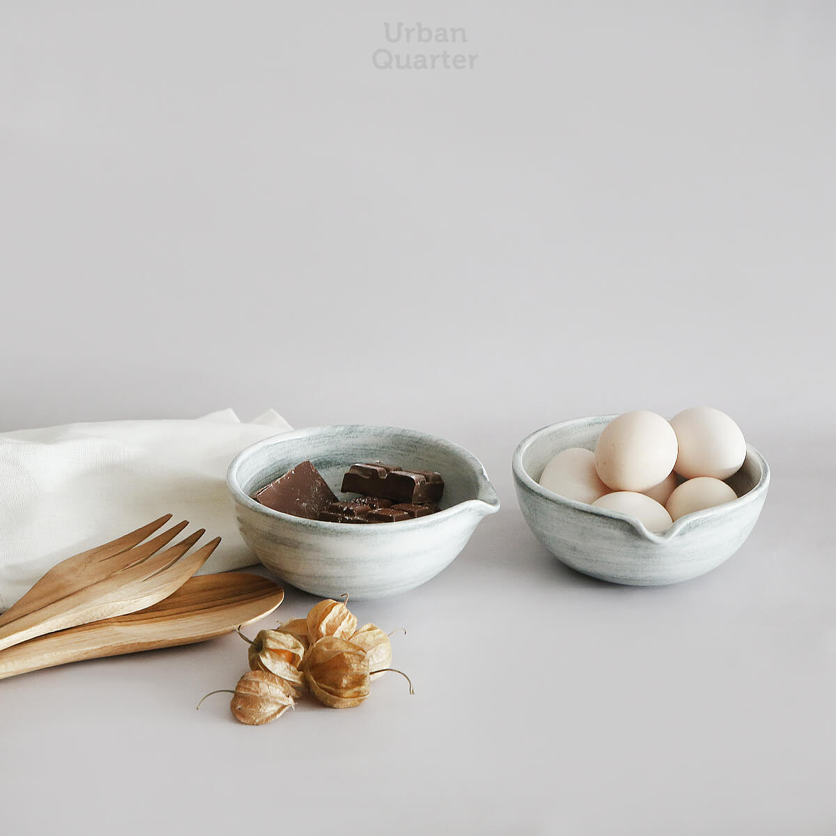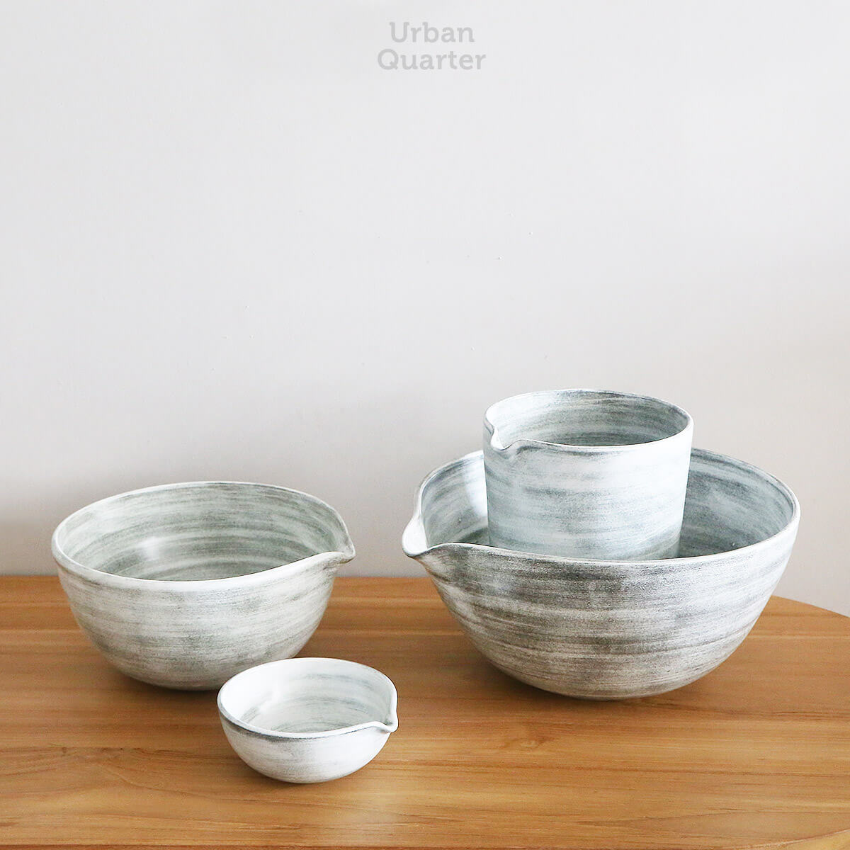 Beautiful ceramic mixing bowls we created for your baking needs. We created these mixing bowls that are stackable, easily organized and have organic shapes with spouts for easy pour. The mini mixing bowl was created for mixing or stirring your eggs or for separating your ingredients before baking or cooking. The bowl is made for easy transfer to the bigger mixing bowls.