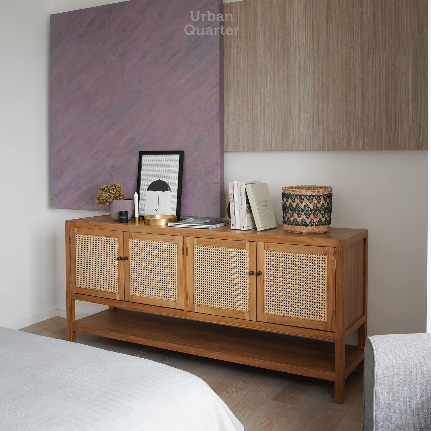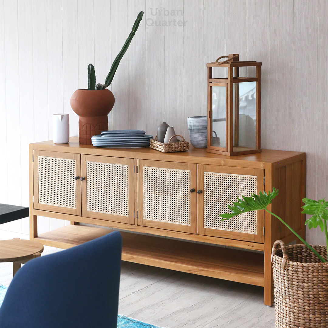 Framed in solid Teak wood and wrapped with natural rattan on the fronts with bronze handles, our Mateo buffet creates an instant statement whether in your hallway or your living room as a TV stand. Four sets of drawers and shelving make the buffet an incredible storage space.