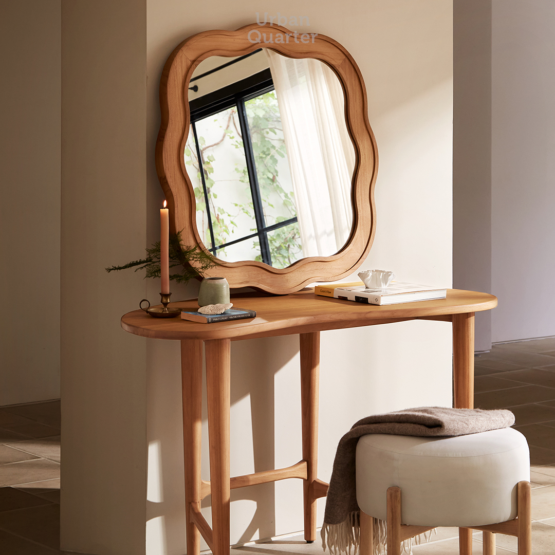 Reflect on elegance with the Meadows Mirror, exclusively at UrbanQuarter.com. Set within a generously wide frame of premium solid teak wood, this mirror merges the richness of natural materials with a cursive rounded design, embodying both charm and character. The Meadows Mirror isn’t just a decorative piece but a testament to timeless craftsmanship—its frame capturing the essence of nature’s beauty while adding depth and allure to any space. Grace your walls with a touch of organic sophistication and let the Meadows be the statement piece that speaks volumes.