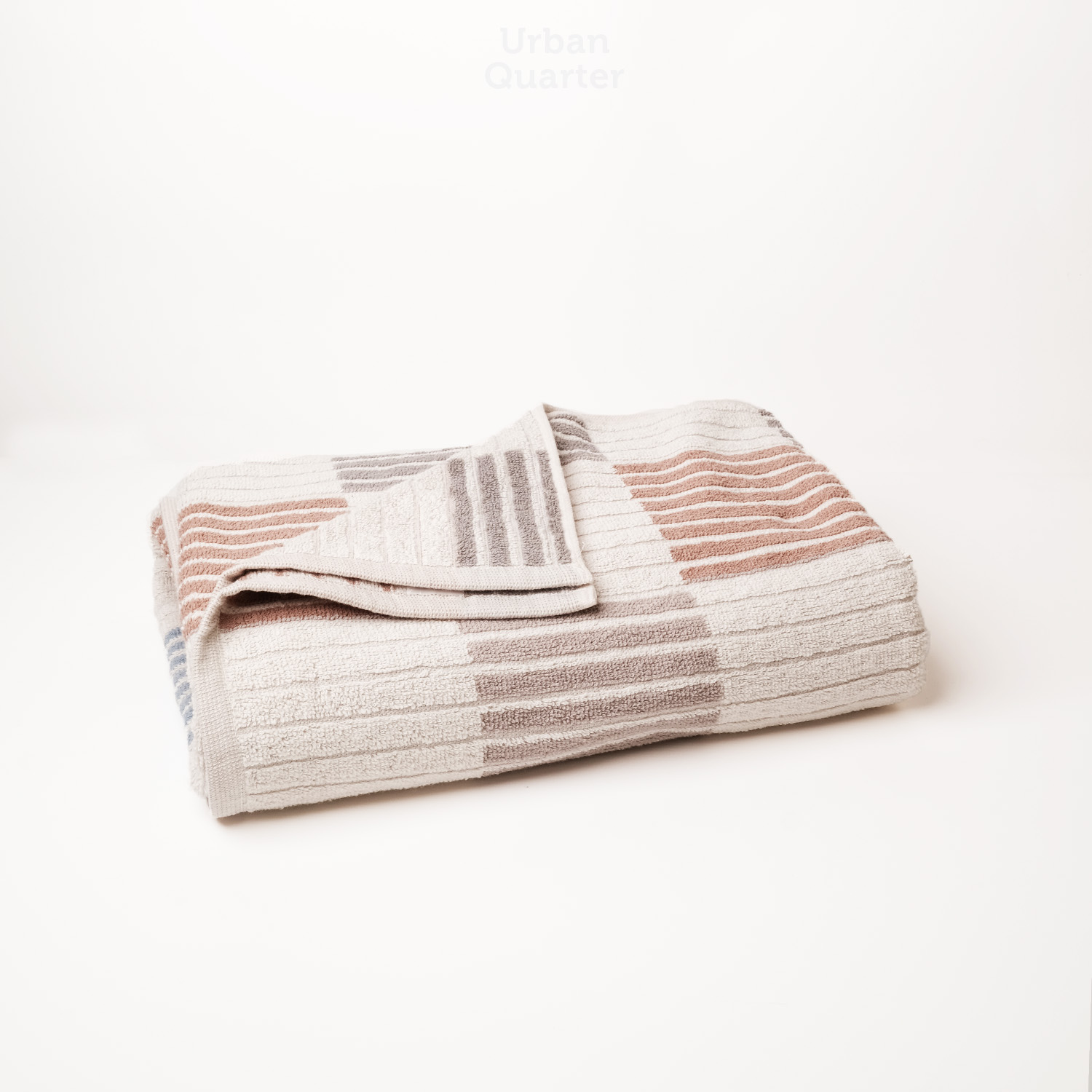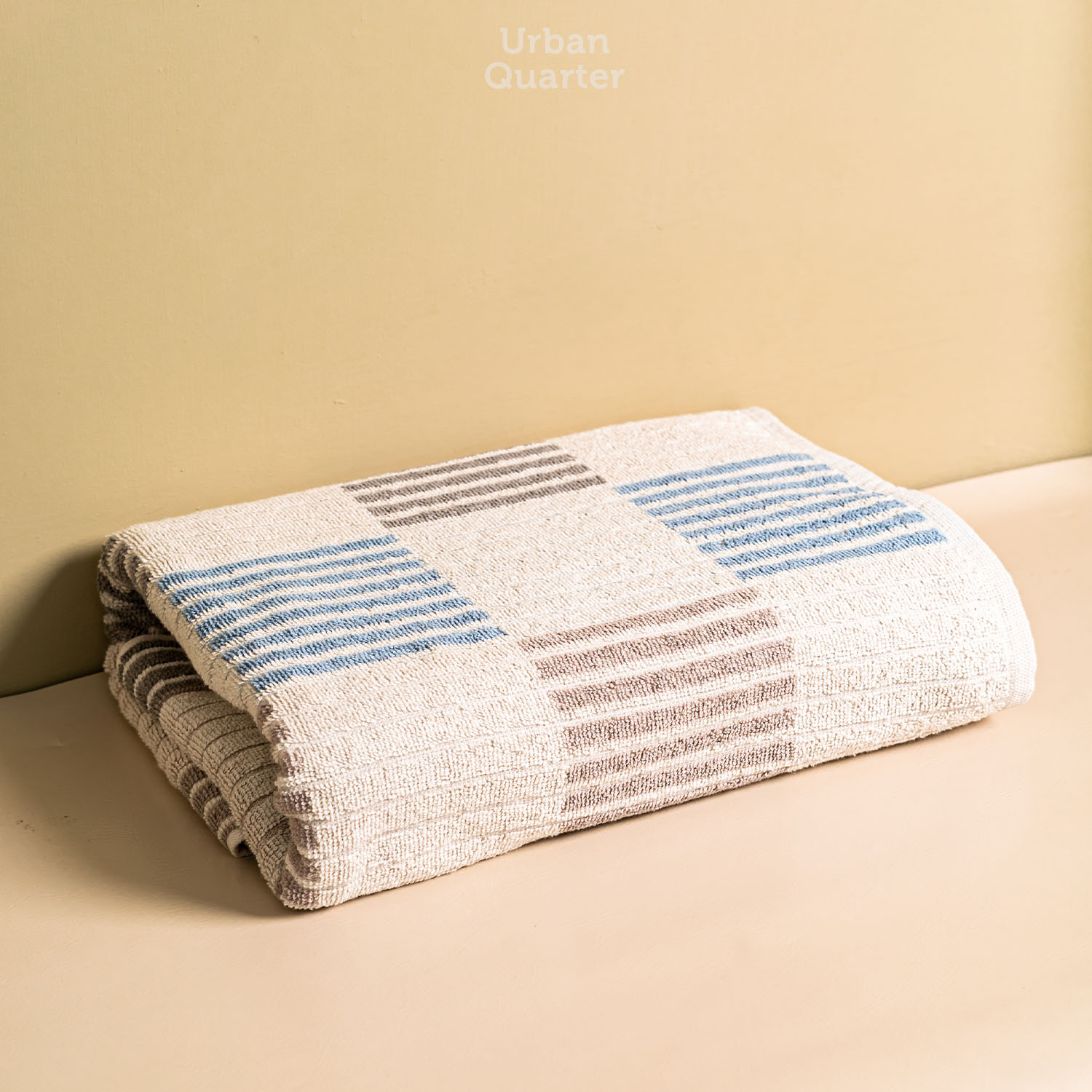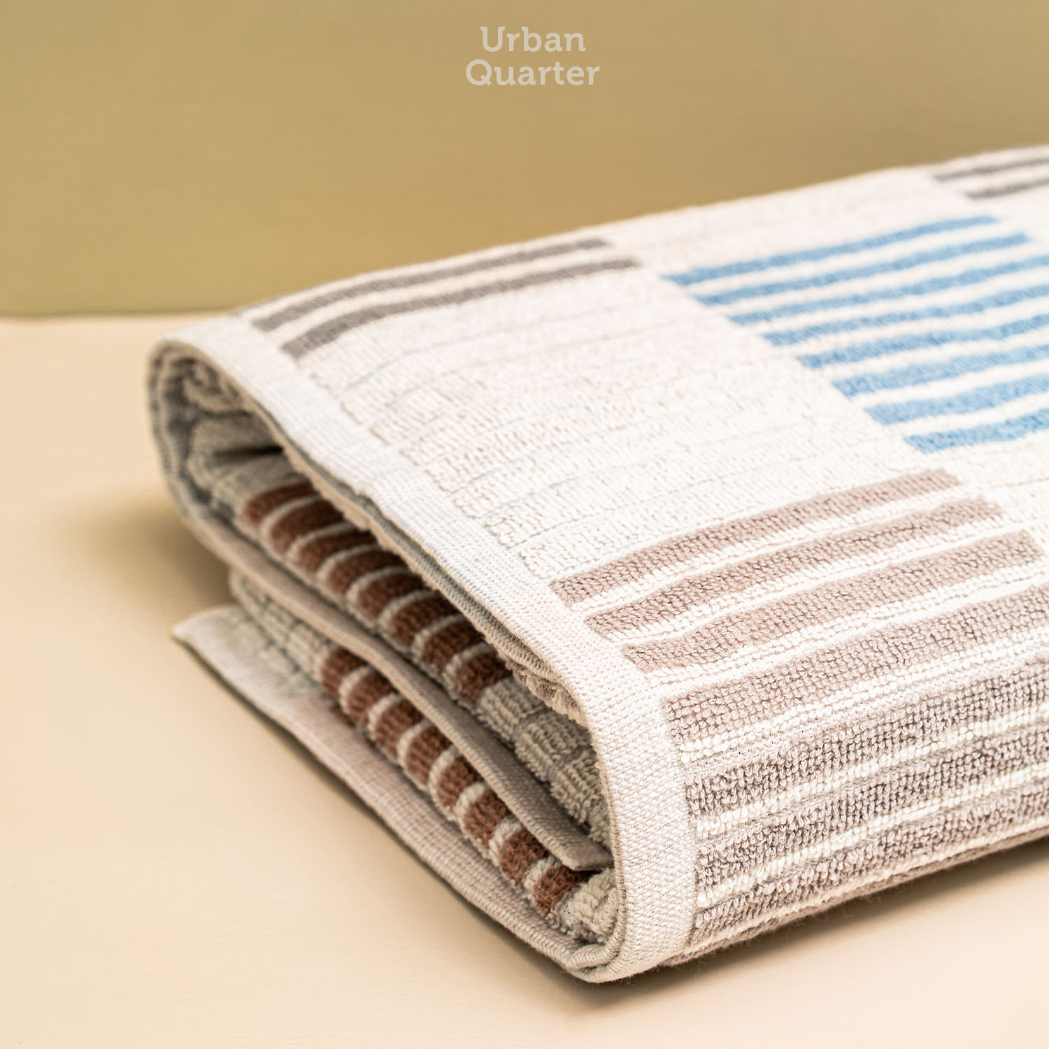 1. 70 x 140 cm. Bath towel with mix of brown and blue lined pattern.