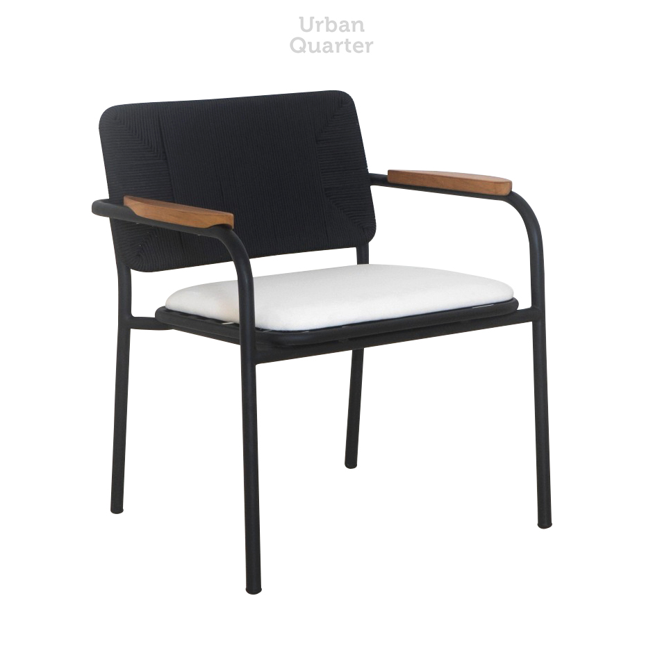 2. Black aluminum frame with woven black rope back and upholstered seating. Teak wood handles on sides of armchair.
