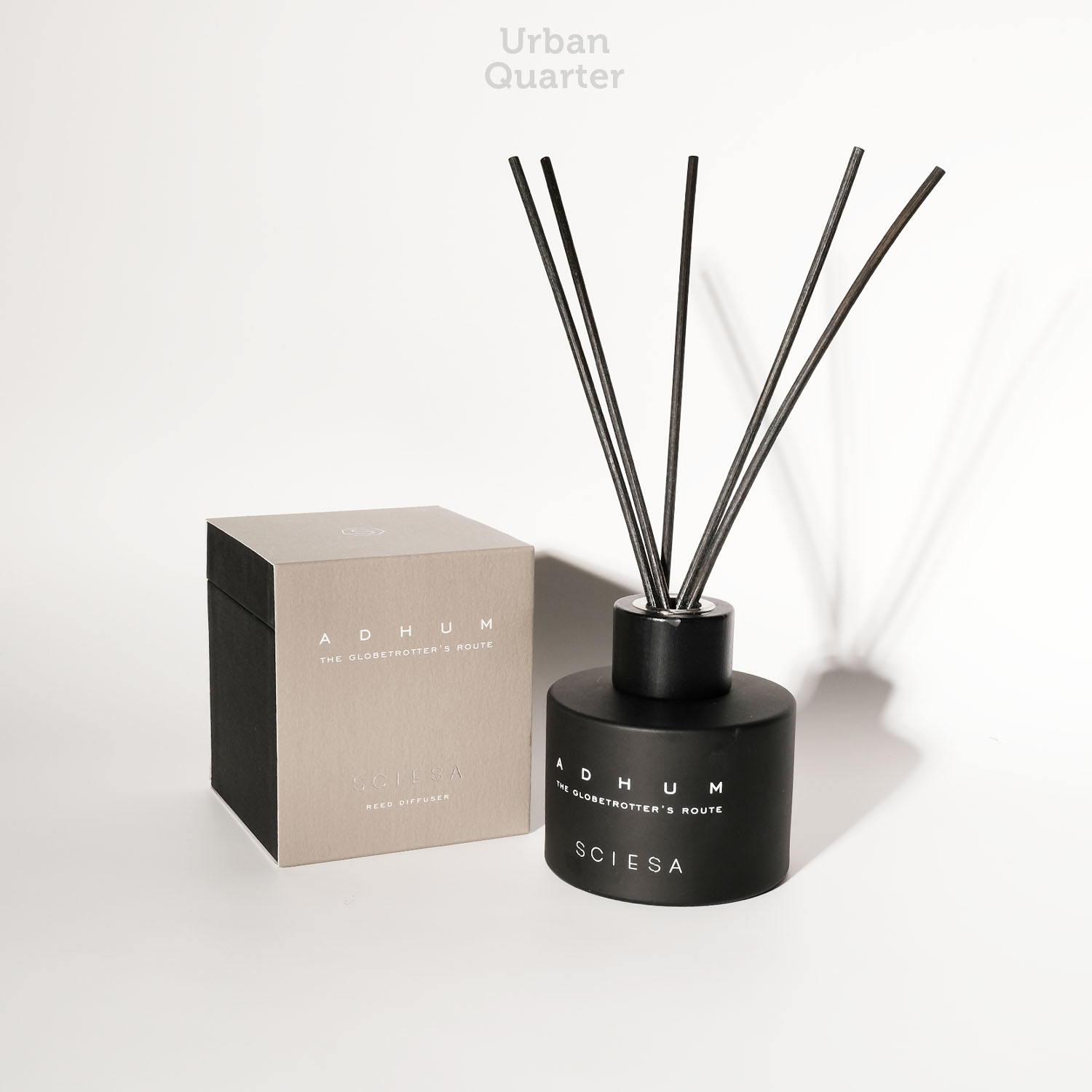 Allow your mind to wander, to uncover a secret path in an ancient forest. The dark woods evoke the mystery of the past. The warmth of Bergamot and Javanese Cedarwood, enclosed with Juniper and Musk, navigate through a midst of crisp moss green. The Adhum mini diffuser by Sciesa allows you to ease your mind at home with its distinct fragrance.