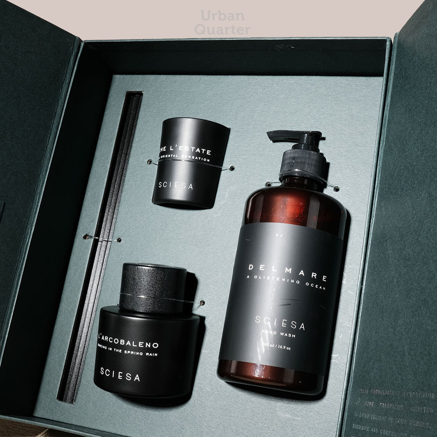2. Gift box includes 1 mini diffuser, 1 mini scented candle and 1 bottle of hand soap from Sciesa.